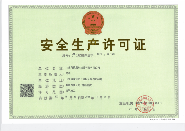近日,菏投潤(rùn)和能源科技有限公司安全許可證獲山東省住房和城鄉(xiāng)建設(shè)廳正式頒證,截止到2021年12月,菏投潤(rùn)和能源科技有限公司已獲得安全生產(chǎn)許可證、承裝(修、試)電力設(shè)施許可證、建筑業(yè)企業(yè)資質(zhì)證書(電力工程施工總承包三級(jí)、機(jī)電工程施工總承包三級(jí))三項(xiàng)證書,這意味著公司步入了一個(gè)全新的發(fā)展階段。