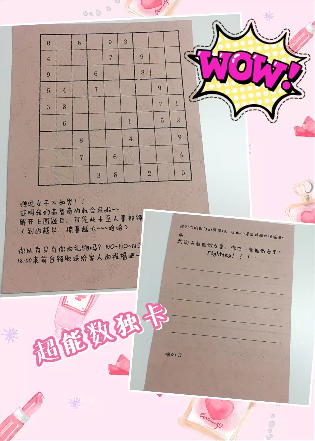 今天世紀(jì)陽天的男同胞也辛苦啦,不僅幫部門女王參考了數(shù)獨卡,還親手寫了祝福語。