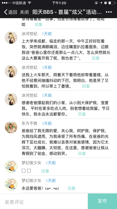 在今年的父親節(jié)中,我們還在世紀(jì)陽天BBS中發(fā)起了“炫父”跟帖活動,鼓勵小伙伴們積極踴躍的與大家共同分享自己與父親之間難忘的故事,不少同事的留言,讓人淚目。與父親的感人事跡歷歷在目,讓人不禁感嘆,歲月的無情與飛逝。