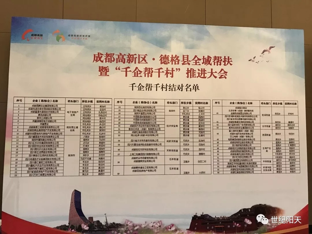 導語:12月7日上午9點,成都市高新區(qū)“對口幫扶德格縣全域幫扶暨千企幫千村”精準扶貧行動推進大會在通威國際中心召開。省、市、區(qū)有關領導共同出席了本次大會。成都世紀陽天旗下互聯(lián)網(wǎng)教育品牌世紀守護CEO唐紅林先生代表公司參加并聽取了會議的主要內(nèi)容。