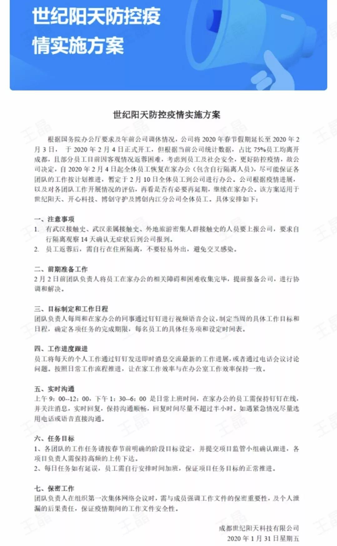 疫情就是命令,防控就是責任。公司堅決貫徹落實中央、省、市關于加強新冠肺炎疫情防控工作的決策部署及公司向董事長的相關工作要求,堅持底線思維、高度警惕、嚴陣以待,積極采取系列措施,切實做好疫情防控工作。同時結合公司實際情況,第一時間發(fā)布了《世紀陽天防控疫情實施方案》。