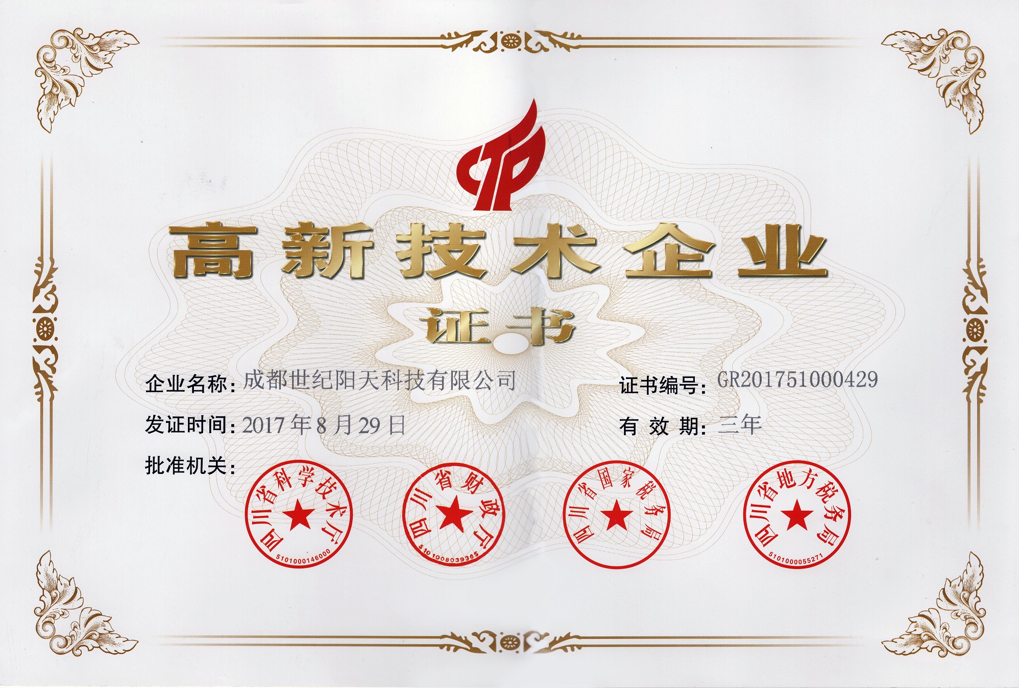 熱烈祝賀成都世紀陽天科技有限公司榮獲“高新技術(shù)企業(yè)”證書